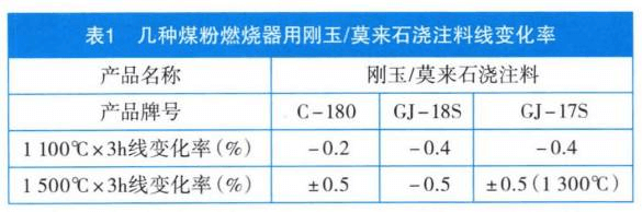 回转窑燃烧器所处位置为前窑口,工作环境温度约为600℃~1 300℃,温度高且波动范围大。由于煤粉燃烧器浇注料为热的不良导体,温度差异导致热膨胀系数不同,使用一段时间后受热不均的部位会产生裂痕。表1为几种煤粉燃烧器用刚玉/莫来石浇注料线变化率(耐火浇注料通常用线变化率表示热膨胀系数)不同温度下的数值。