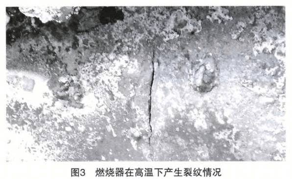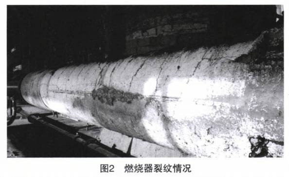 除此之外,在浇注料施工过程中采用横向施工,由于重力作用,筒体上半部分浇注料与下半部分浇注料难免存在差异,密度不同导致导热不均,也会容易产生裂纹,该燃烧器后半段为典型早期裂纹情况见图2。