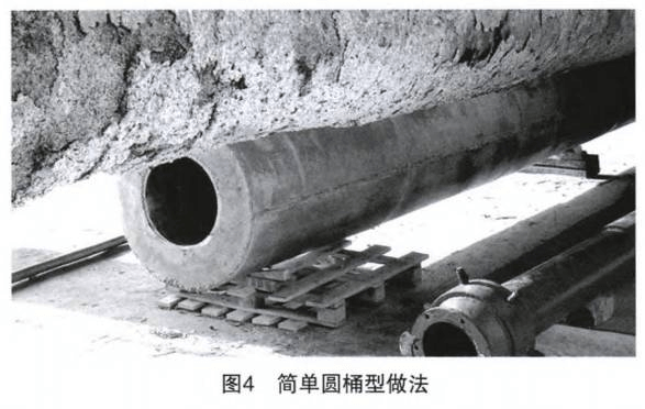 在回转窑窑内气流中,煤粉燃烧器所产生的一次风外侧易产生回旋涡流,气流会带动一些煤粉粘结在煤粉燃烧器头部,产生结焦现象,随着结焦逐渐增多、扩散,从而干涉火焰形状,导致燃烧器两侧温度不均。所以煤粉燃烧器不能简单浇注成圆桶型,图4为简单圆桶型做法。而应浇注成倒角(建议30°~40°),倒角浇注方式能够简单有效地降低结焦现象见图5。